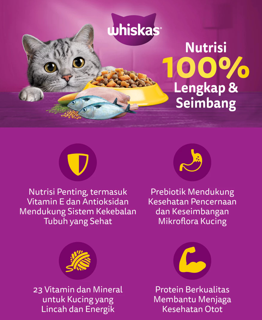 Setiap 100g Whiskas kering, mengandung 354 kcal energi, memastikan nutrisi lengkap dan seimbang untuk kucing Anda. Pastikan untuk selalu menyediakan air segar untuk kesehatan dan kesejahteraan kucing Anda.