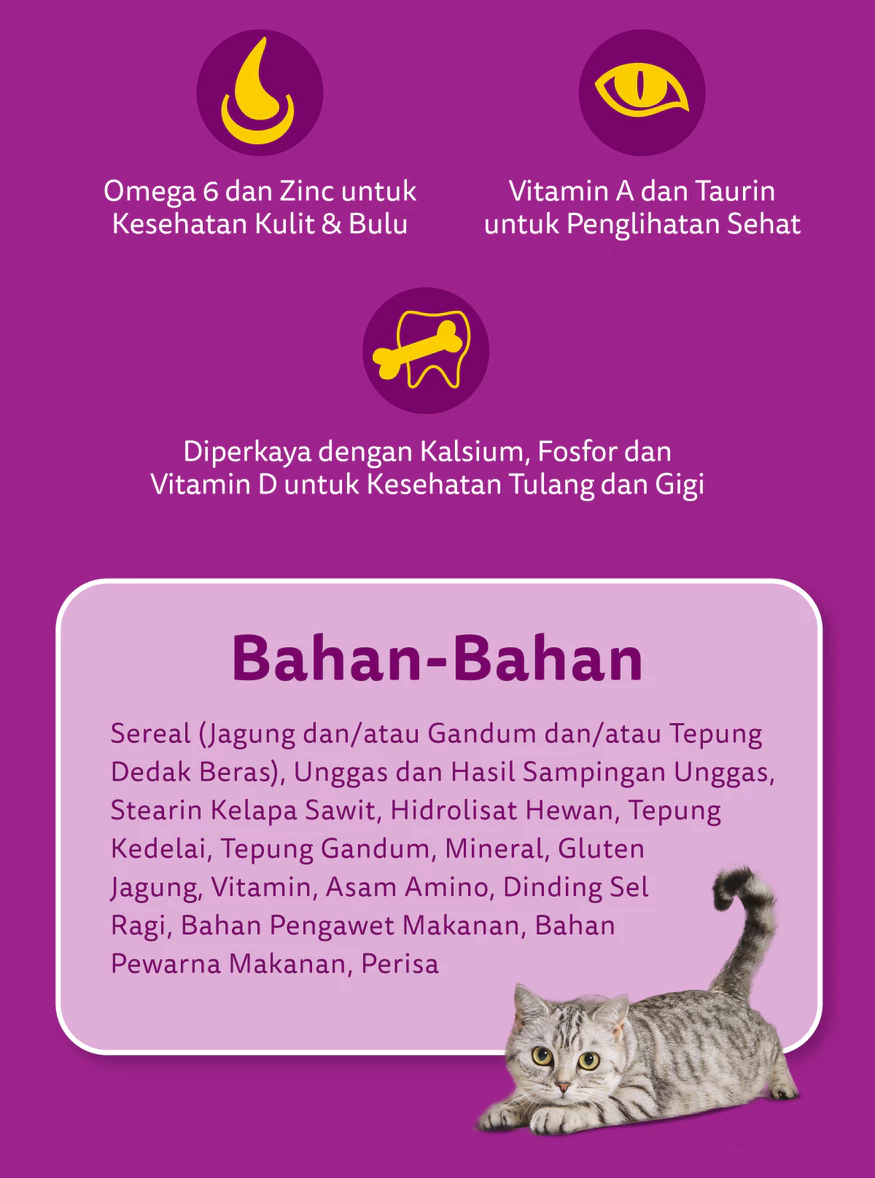 • Untuk Mata yang Sehat dan Tulang yang Kuat: Formula makanan kucing kami mencakup Vitamin A dan Taurin untuk penglihatan tajam dan diperkaya dengan Kalsium, Fosfor, dan Vitamin D untuk tulang dan gigi yang kuat👀