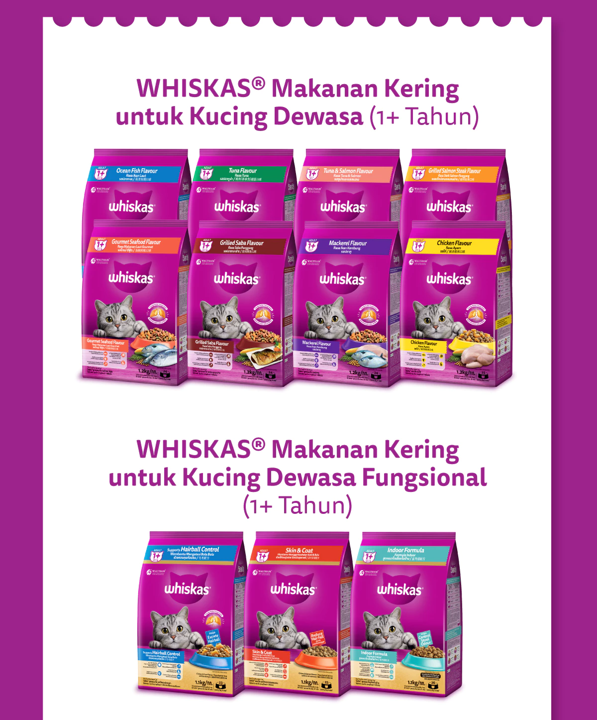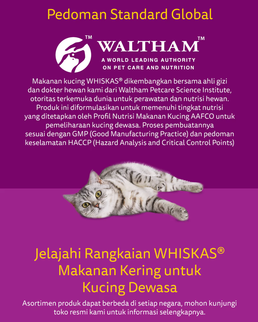 Pilih WHISKAS Adult Urinary Care untuk kucing yang sehat, puas, dan terawat dengan baik. Formula kami yang kaya nutrisi memastikan teman kucing Anda berkembang dan menikmati setiap hari dengan penuh. Percayakan WHISKAS untuk selalu ada di samping kucing Anda dalam setiap langkah perjalanan dewasanya. 💞